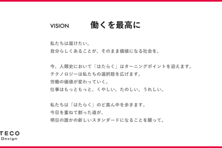 新Vision「働くを最高に」を策定 2026年3月3日 プレスリリース 株式会社TECO Design(本社:東京都新宿区、代表取締役社長:杉野 愼、以下:当社)は、新たなVisionステートメント「働くを最高に」を策定しました。 Vision策定の背景 少子高齢化、人材不足、生成AIの進化、働き方の多様化。 「はたらく」を取り巻く環境は、かつてないスピードで変化しています。 一方で、現場ではいま... 続きを読む