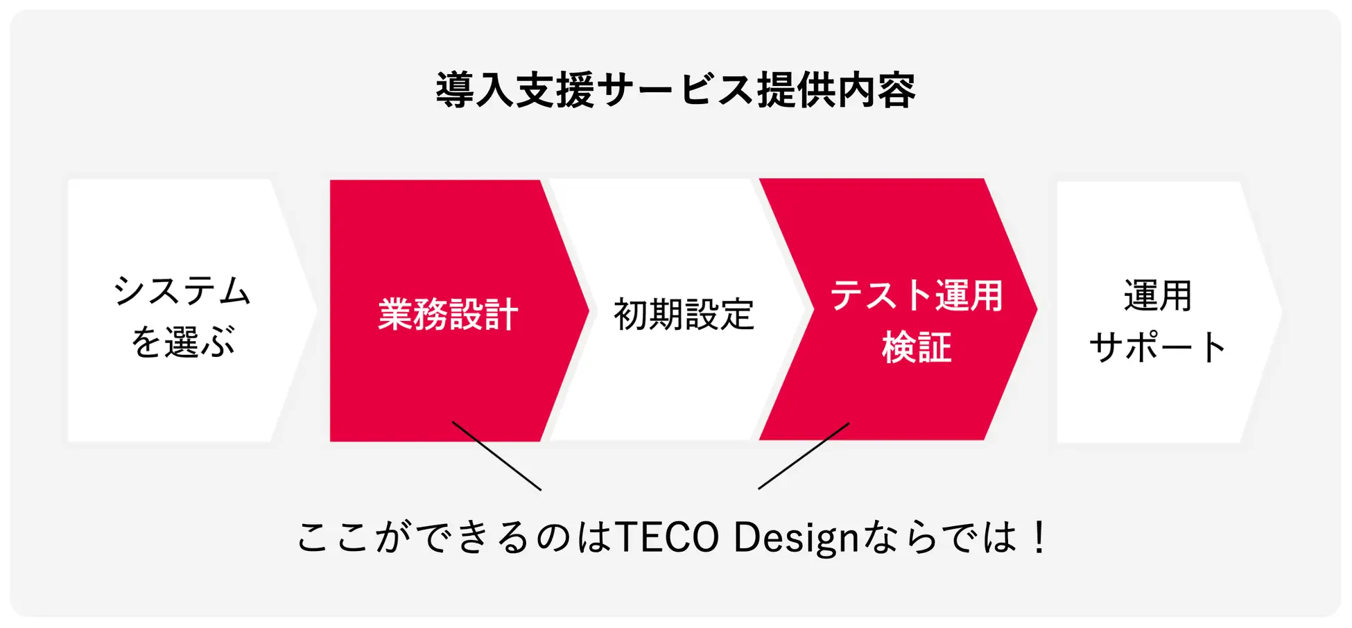 ※「業務設計」とは、現状の業務内容を整理し、システムに合わせて最適な形に整えるプロセスのことです。