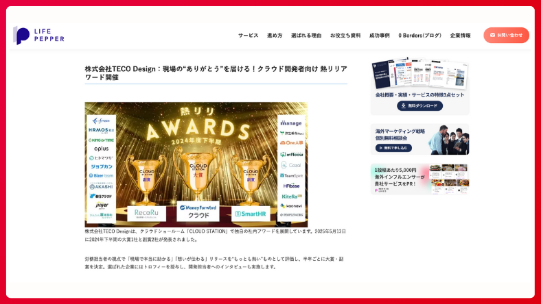 この度、海外デジタルマーケティング支援1000社の実績を持つ株式会社LIFE PEPPER様が運営されている 「0 Borders」にて、弊社のクラウドショールーム「CLOUD STATION」で展開している独自の社内アワード「熱リリアワード」をご紹介いただきました。